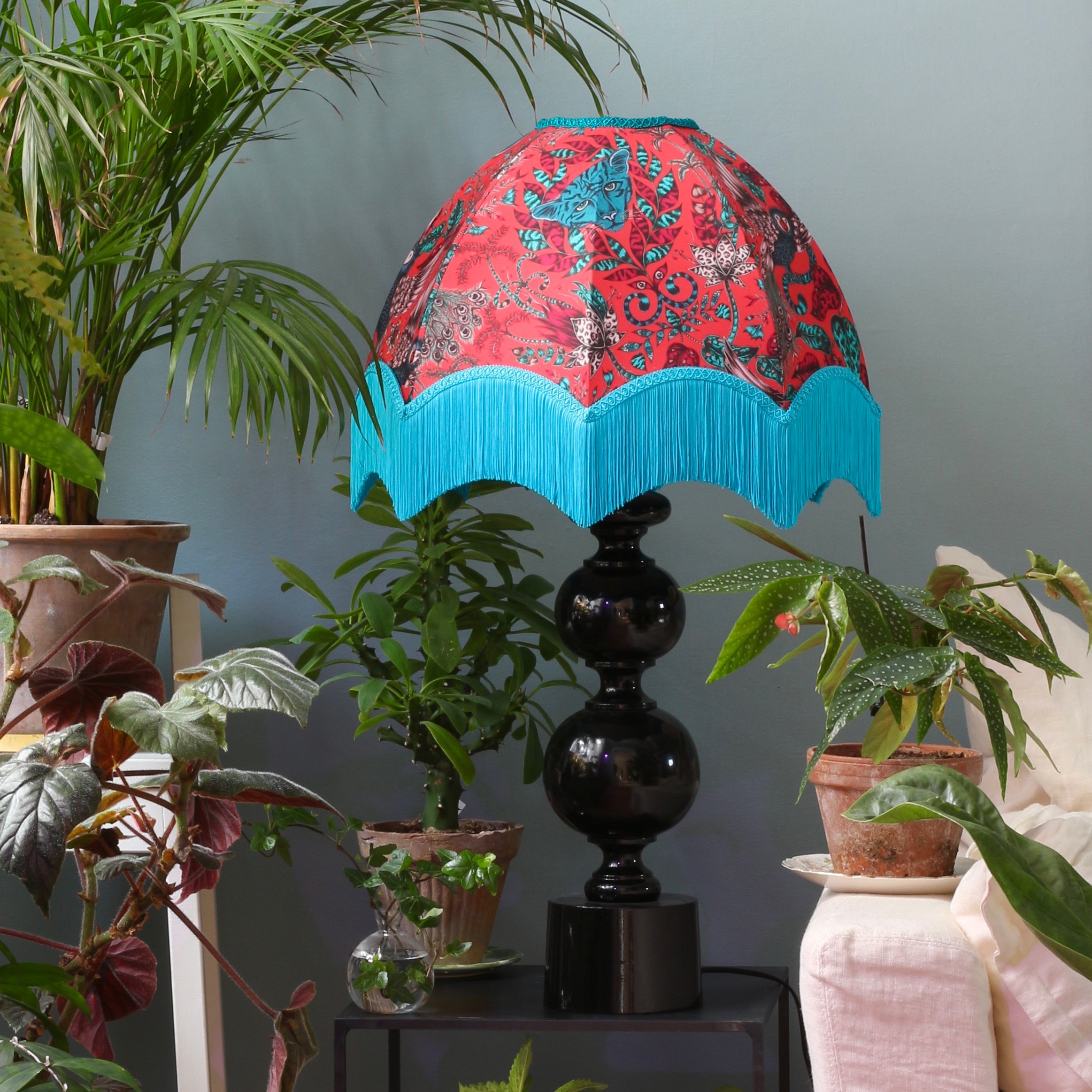 Vacker lampskärm bomullssatin med färgstarkt djungelmotiv.